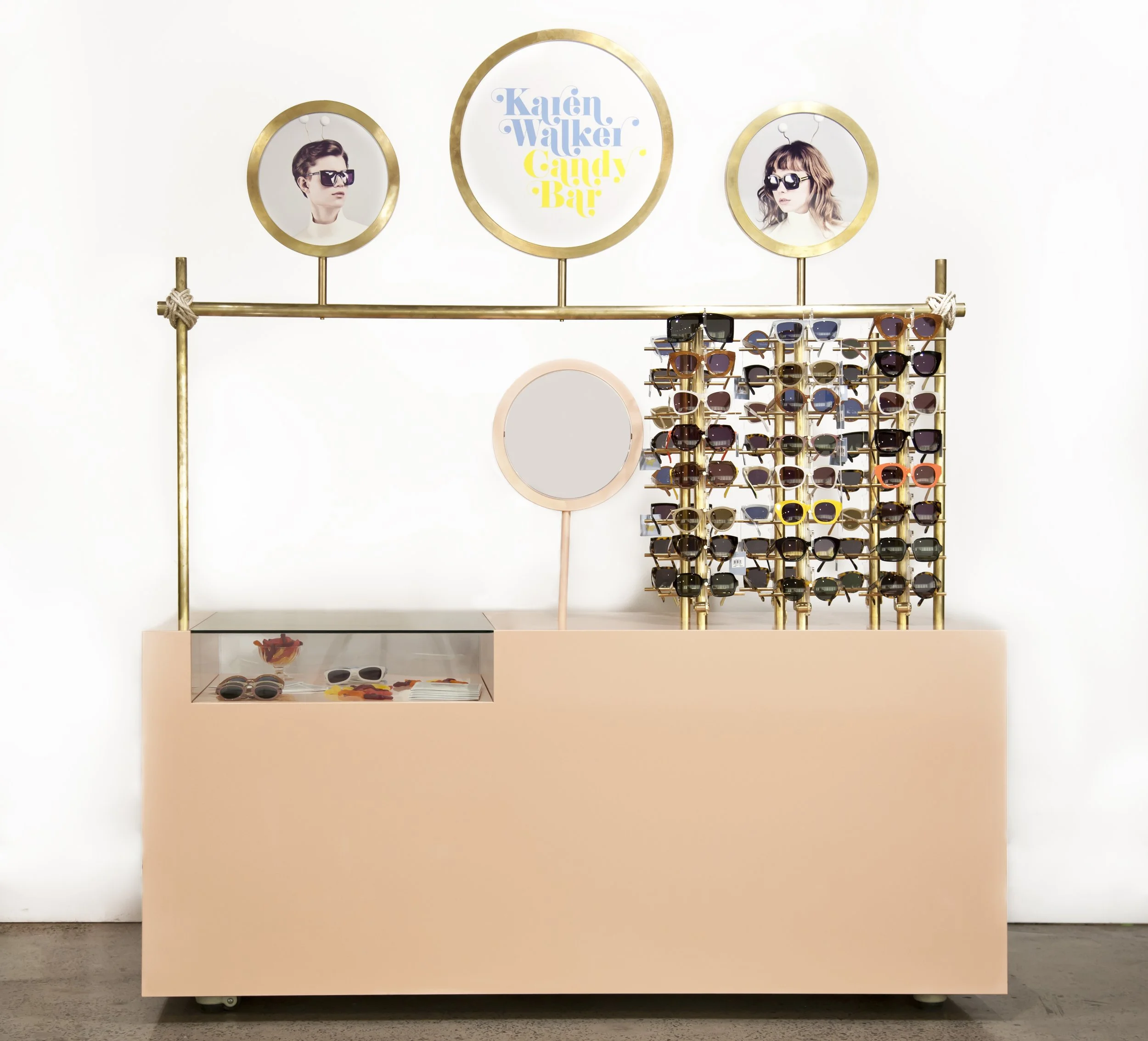 The portable Karen Walker Candy Bar is a pop-up concept that enables fashion label Karen Walker to take an exclusive range of products directly to customers in new locations. The pop-up shop is beautifully detailed, featuring a brass canopy & sunglasses display trees and is finished with colours from the Karen Walker paint range